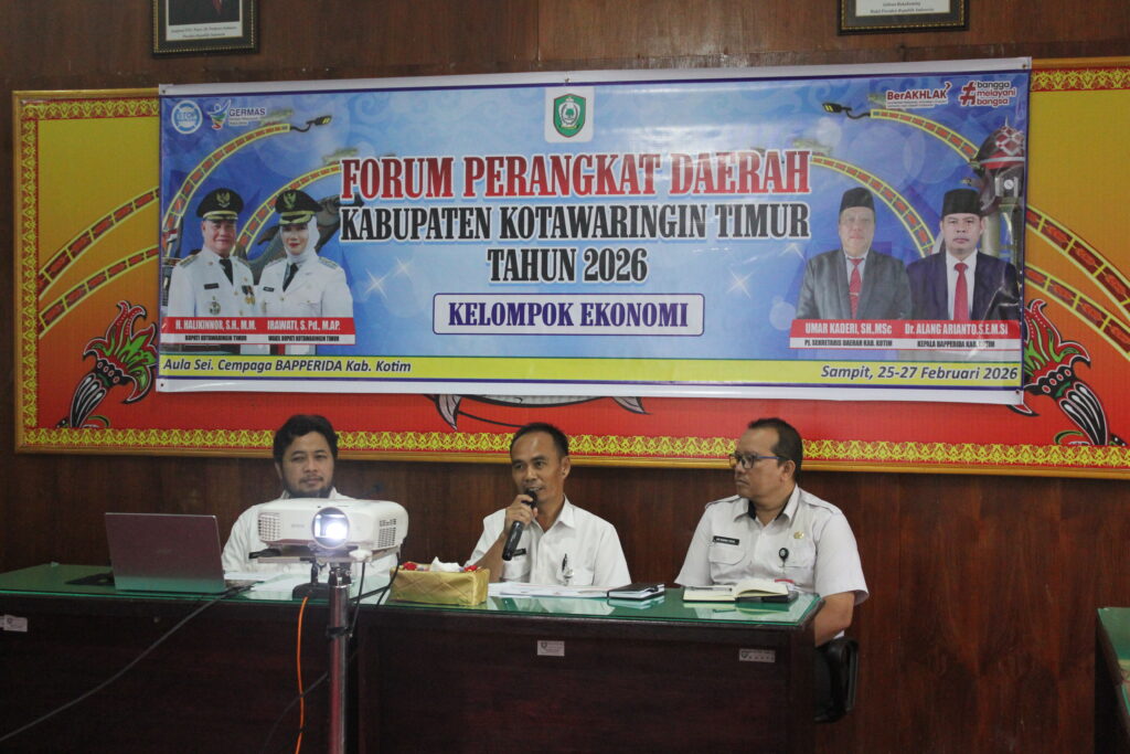 Sampit – Pemerintah Kabupaten Kotawaringin Timur melalui Badan Perencanaan Pembangunan, Riset dan Inovasi Daerah Kabupaten Kotawaringin Timur (BAPPERIDA) melaksanakan Forum Perangkat Daerah Tahun 2026 Kelompok Kerja (Pokja) Ekonomi pada Rabu–Kamis, 25–26 Februari 2026, bertempat di Ruang Rapat Sei Cempaga Bapperida Kabupaten Kotawaringin Timur, Sampit. Kegiatan ini bertujuan untuk membahas dan menyelaraskan rancangan Rencana Kerja (Renja) Perangkat Daerah.